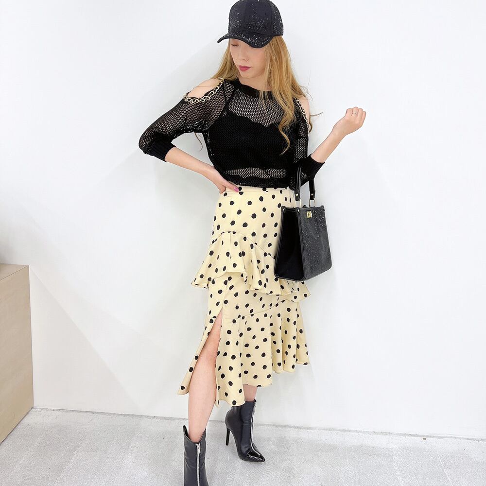 ドット柄とボリュームのあるティアードデザインがかわいいロングスカート★